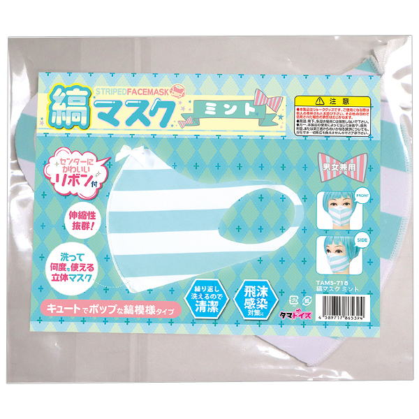 真ん中に可愛いリボンを装飾した白×ミントグリーンの爽やかな縞パン風立体マスク。伸縮性が高くフィット感抜群!洗って繰り返し使えて経済的かつ常に衛生的♪撮影会やイベント時の飛沫感染対策や花粉症予防、ウイルス対策に是非いかがでしょうか?男女兼用●メーカー型番:TAMS-718