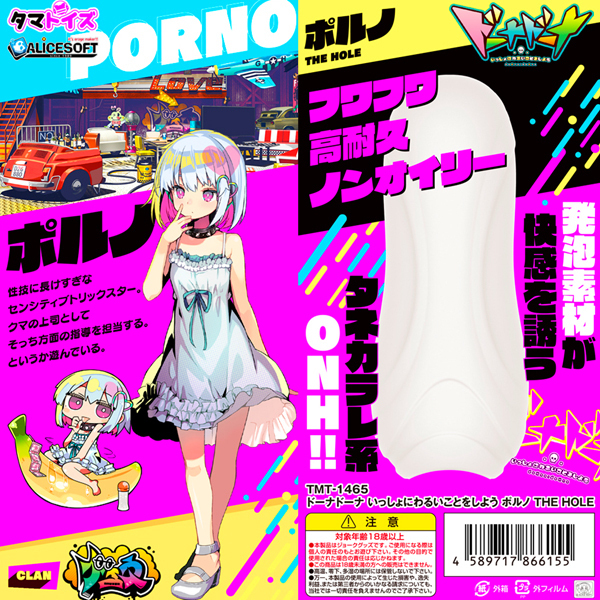 アダルトゲームメーカーのアリスソフトとタマトイズとのコラボ商品!「ドーナドーナ いっしょにわるいことをしよう ポルノ THE HOLE」。こちらのポルノはランダムなヒダタイプでバキュームや絡みつくストローク感が特徴的です♪新開発の発砲シリコン素材によるふわふわと柔らかい感触。しっかりと回転させつつ使うことによるバキューム感と発砲素材による快感!絡みつくような渦巻くスパイラル刺激で発射(だし)て、射精(だし)て、放精(だし)まくれ!