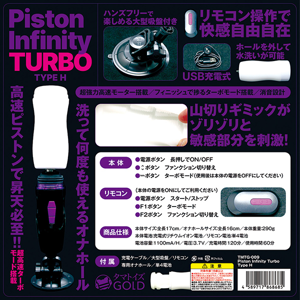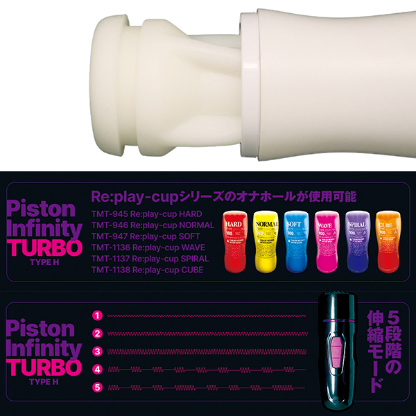 電動オナホも遂にここまで来ました!手持ちはもちろん、ハンズフリーでも楽しめる電動ピストンオナホール「Piston Infinity Turbo Type H」。挿入したままで5段階の伸縮モードを操作できる遠隔リモコン付き!付属のホールは肉ヒダ感が楽しめピストンとの相性も良さそう♪専用のカップホールと本体をネジ式でセッティングする仕様になっていて、付属の吸盤アダプターを取り付けることでハンズフリーでピストンオナニーが楽しめます!電源はマグネット式のUSB充電タイプで120分のフル充電で60分の連続稼働。5段階の伸縮モードを専用のリモコンで操作できるのでハンズフリーで快適な操作がお楽しみ頂けます♪●メーカー型番:TMTG-009 ●メーカー型番:TMTG-009