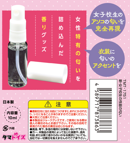 新製法エタノールフリー、女子校生のアソコの匂いを完全再現、リアルな匂いに大興奮!!発情した女子校生の濃厚な匂い、女性フェロモンたっぷりの淫臭、匂いで感じる新感覚、あのとき感じたあの匂いをもう一度、女性の特有の匂いを詰め込んだ香りグッツ、衣装に匂いのアクセントを。●メーカー型番:TMT-1751