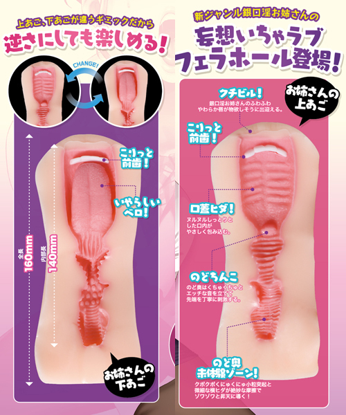 人気同人作家ヨッコラ氏による作家認定商品!こちらの銀口淫お姉さんはフェラホ好きにはたまらない前歯付きの非貫通オナホとなっています。激フェラ バキュームAIKAや真実の口、口姦と並ぶほどの気持ちよさ!歯のとっかかり具合や舌の感触、舌と口蓋ヒダによる優しく包み込む刺激が心地良い♪欲求不満がたまった銀口淫のお姉さんのおクチを口淫!ざらざらした舌と柔らかい歯の感触、喉奥で音をたてながらのジュポジュポとしたギミックは快感必至です。上あごのコリッとした前歯や下あごの舌のギミックで、妄想いちゃラブなフェラの気持ちよさ2度お楽しみ頂けます!