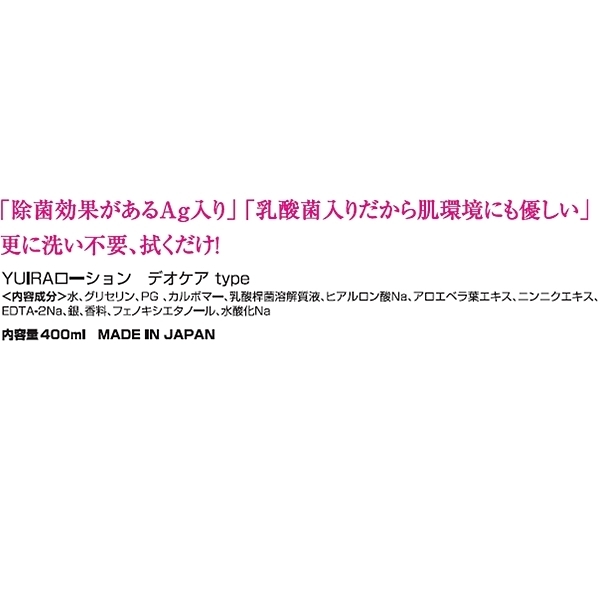 YUIRAより、デオケア成分配合の洗い不要ローションが新発売。・除菌効果があるAg入り・乳酸菌入りだから肌環境にも優しい・洗い不要、拭くだけ簡単処理!ムスクの香りも付いて使用後の気になる匂いも軽減!400mlの丁度いいボリューム感!普段使い様のスタンダードモデルです!※安心安全の日本産商品です。<内容成分>水、グリセリン、PG、カルボマー、乳酸桿菌溶解質液、ヒアルロン酸Na、アロエベラ葉エキス、ニンニクエキス、EDTA−2Na、銀、香料、フェノキシエタノール、水酸化Na<使用上のご注意>・非常に滑りやすいのでご使用の際は十分に注意してください。・誤って飲み込んだ場合、お肌に合わない時はすぐに使用を中止し専門医に相談してください。・お子様の手の届かないところで保管してください。・直射日光のあたる場所、高温・多湿の環境での保管は避けてください。・目に入った場合は綺麗な水、又はお湯で洗い流してください。・開封後はなるべくお早めにご使用ください。