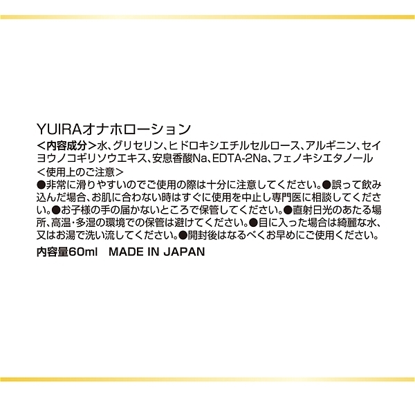 YUIRAより、使いやすいミニボトルサイズ(60ml)のローションが5種類一挙リリース量が多すぎる持ち運びずらい、そんなアナタにピッタリの商品です!オナホ専用配合!アルギニン、ノコギリヤシ成分によりチ〇コの持続力UP!使用しながらチントレも出来ちゃいます!ウォーターベースだから肌馴染みが良く、洗い流しも簡単♪ホール使用時のスタンダードモデルです!安心安全の日本産商品です。<成分>水、グリセリン、ヒドロキシエチルセルロース、アルギニン、セイヨウノコギリソウエキス、安息香酸Na、EDTA-2Na、フェノキシエタノール