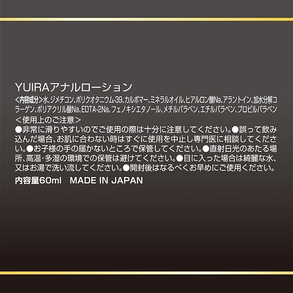 YUIRAより、使いやすいミニボトルサイズ(60ml)のローションが5種類一挙リリース量が多すぎる持ち運びずらい、そんなアナタにピッタリの商品です!アナル専用配合!乾きにくく潤い持続!ヒアルロン酸、コラーゲン入りでお肌にも優しい!アナニー時のスタンダードモデルです!安心安全の日本産商品です。<成分>水、ジメチコン、ポリクオタニウム-39、カルボマー、ミネラルオイル、ヒアルロン酸Na、アラントイン、加水分解コラーゲン、ポリアクリル酸Na、EDTA-2Na、フェノキシエタノール、メチルパラベン、エチルパラベン、プロピルパラベン