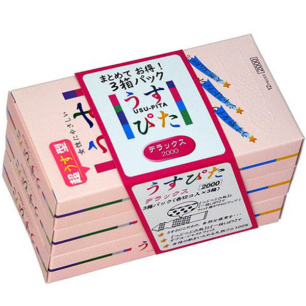 一気に大量に欲しいあなたに!お得なまとめ買いができるコンドーム「うすぴた2000」の3箱セットです。一箱に12個入りだから計36個のコンドームをGET!ゴムはうす型ウェットゼリータイプ。カリ&サオの境目にできたクビレがキュッと締め付けるだけでなく、先端部とサオには無数のツブツブが付いているので膣内にもより大きな刺激を与えます。