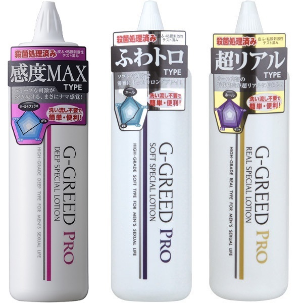 いつものホールが生まれ変わる?内部の構造をリアルに伝えてくれる水溶性ローション「G-GREED PRO(リアルスペシャル) 300g」。●ポリアクリル酸ナトリウム不使用なので洗い流す必要ナシ●殺菌処理済&皮膚・粘膜への刺激性テストもクリア●肌に優しい弱酸性・無着色・無香料●回転させるとオープンする先細り型ノズルで充填ラクラク。リアルな密着感を生み出しながらも肌に優しい使い心地がグッドポイント!オナホールの入り組んだ特殊構造にも滑らかに対応し、より生々しい挿入感が楽しめる潤滑ローションです。