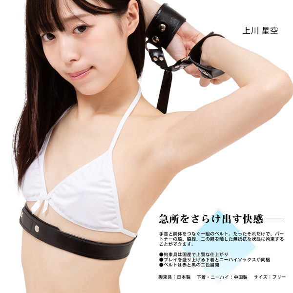 ボツ腋も黒ずみ腋も全て丸見えに出来るフェチに特化した辱め遊戯シリーズ「ワキ見せ拘束」。手首と胴体を一組のベルトで繋ぎ止め、ワキだけでなく、わき腹や二の腕までを晒し無抵抗な状態で動きを制限!ベルトは高品質な日本製で、手軽に使えるマジックテープ式♪他にもブラ、紐パン、ニーハイ付属!パッケージの元AV女優「上川星空」さんと同じように完成します。Fサイズ、ブラック