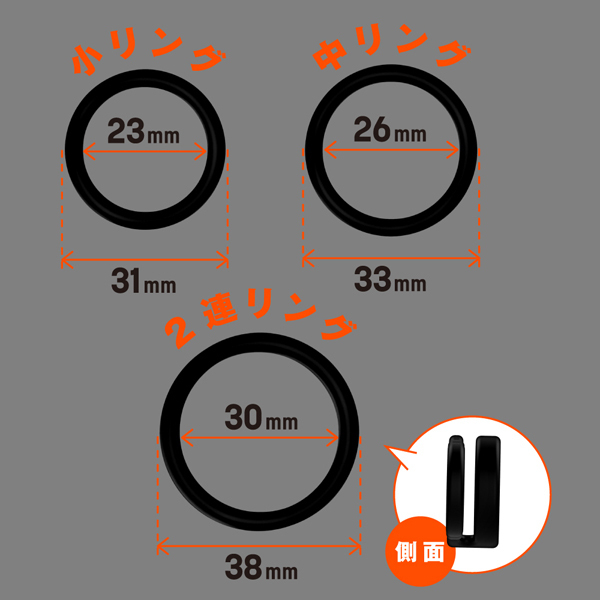 しっかり固定して外れにくい!高品質シリコンの弾力性に優れたペニスリング。ベタつきのないサラスベ質感で着け心地抜群!一つだけ使うも良し同時装着もOK♪皮戻り防止や持続力アップなどシチュエーションに合わせてお使いください。内径23mmの小サイズ、26mmの中サイズ、30mmの2連リング、そして自分の身体に合わせてサイズ変更できる内径調整リングの4個付属。