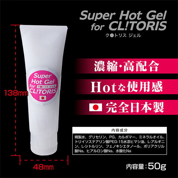 優しく塗り込むとジンジンホットになってくる!熱く、淫らに、官能的に。ホットな刺激を濃縮高配合した成分を贅沢に詰め込んだ女性用ジェル「Super Hot Gel for CL!TORIS クリトリスジェル」。大容量の50gでたっぷり使えます♪国産成分、国内工場での一貫生産品ですから安心してお楽しみ頂けます。