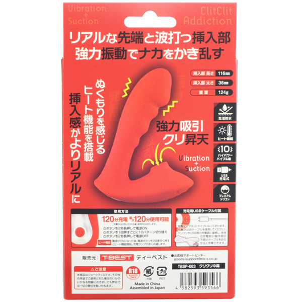 これさえあれば中イキ派もクリ派も大満足の欲張り2点攻めバイブ「クリクリ中毒」。リアル形状の先端が挿入感をしっかり感じさせながら波打つ挿入部が腟内をしっかり振動してくれます♪クリ吸引も強力でハイパワー!クリトリスを攻め立てながらGスポットも刺激する2点攻めで快感も最高潮♪10種類の強力振動と吸引機能でナカも外も同時に開発しながらイカせてくれます。ぬくもりを感じるヒート機能を搭載しているので寒い日でも冷たくなく、人肌の暖かさで挿入感がよりリアルに感じられます♪高級シリコンを使用しているので肌触りも最高。生活防水仕様なのでご使用後はしっかり水洗いが出来ます♪電源はUSB充電式でフル充電120分で連続稼働120分です。