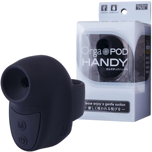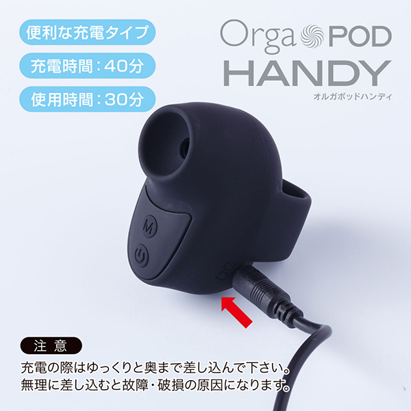 可愛いデザインと確かな吸引力で人気のオルガポッド・シリーズから指にはめて使用する超小型サイズの「オルガポッドハンディ(ブラック)」が登場!3段階のパワー強弱と7段階の振動パターンが楽しめて、お肌に優しいシリコン素材だから、つるっとした柔らかい感触をお楽しみいただけます。40分の充電でおよそ30分の連続使用が可能♪IPX5相当の防水性能を完備しており、使用後は優しく洗い流すことも可能です(水の中に沈めることは、おやめください)。操作も簡単で電源スイッチを長押しで吸引スタート!小型なのでパワーでは他のオルガポッド・シリーズに敵いませんが、優しく心地よい吸引振動をお届け致します♪カラーバリエーションはピンク・ブルー・ブラックの3色展開!小型で使いやすい、魅惑の吸引体験をお楽しみください。