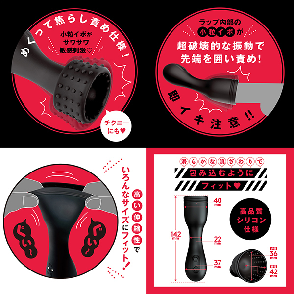 敏感ゾーンを包み込んで超集中刺激!!即イキ注意!!肌ざわり滑らかな高品質シリコン仕様&高い伸縮性でいろんなサイズを包み込むようにフィット♪敏感な先端をラップ内部の小粒イボが超破壊的な振動で囲い責めするローターです!ラップをめくって焦らし責め仕様!小粒イボがサワサワと敏感に刺激!チクニ―にもオススメ♪充電時間約120分、最大連続稼働時間約90分(初期振動パターン未変更時)。IPX7等級、静音設計<40dB、9パターン振動