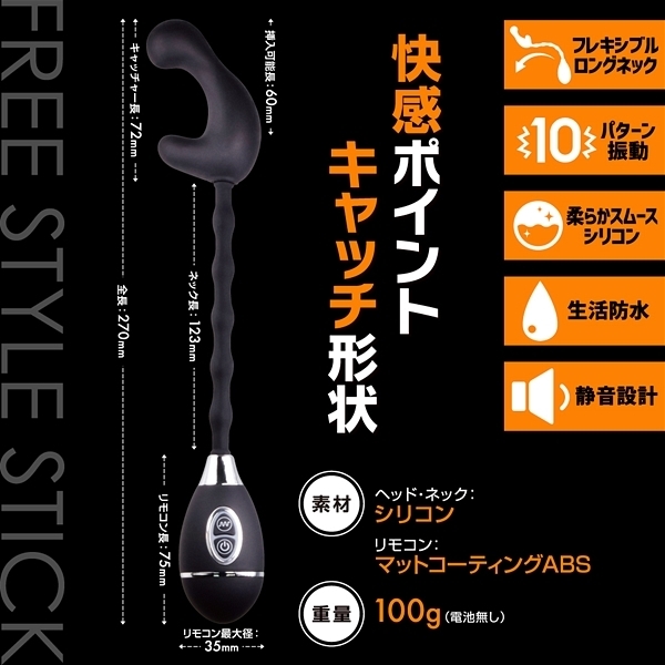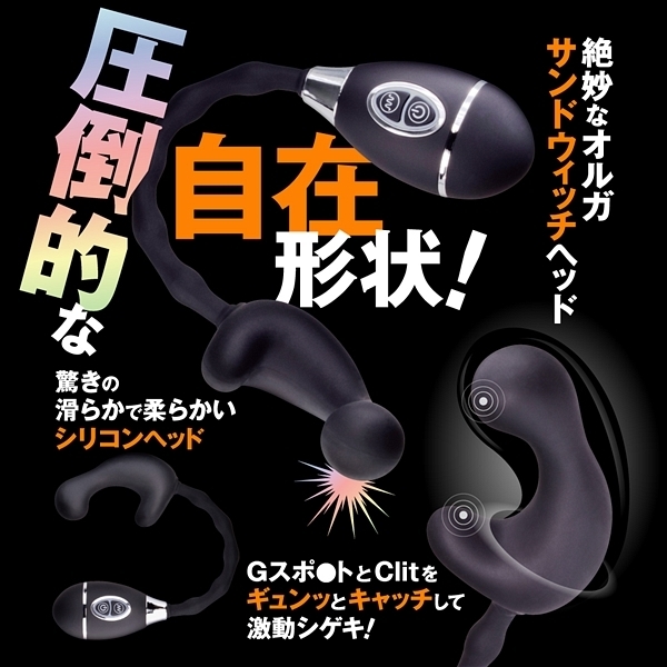 長いネックが自在に曲がって楽しめるフレキシブルネックローター。先端はこだわりのオルガサンドウィッチ形状で快感部分をしっかりキャッチします。高品質シリコン素材採用の先端がGとClitをしっかりダブル刺激。しっかり楽しめる10パターン振動にプレイの邪魔をしない静音設計。生活防水。グイグイ責めれるスティックGローター!