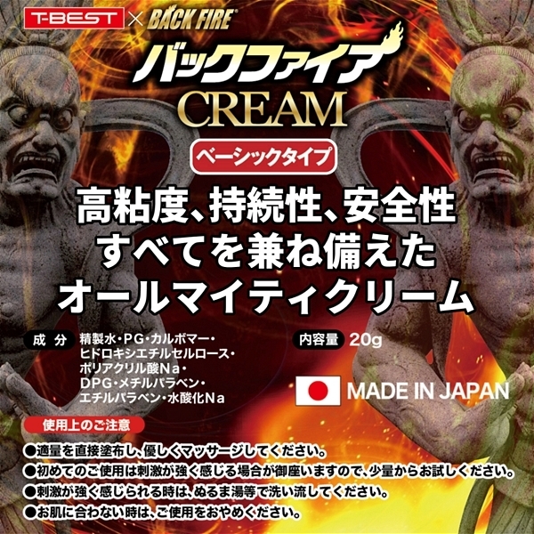 バックファイアーからア●ル専用クリームの登場です!少量の使用で長時間のプレイが可能!ローションのタイプより持続するので、乾きにくくプレイに集中できます。驚きの潤滑性!クリームの特性をいかし驚きの潤滑性を実現しました。ローションと異なり、液だれの心配がなく、アダルト玩具との相性も抜群です。ミネラルオイル配合で乾きにくく、肌にも優しい成分を使用しています。また、グリセリンを配合していないので、おなかが緩くなったりしません。ノンラベル仕様なので、鞄などに入れて持ち歩いても、ア●ル用クリームとばれないので安心です。