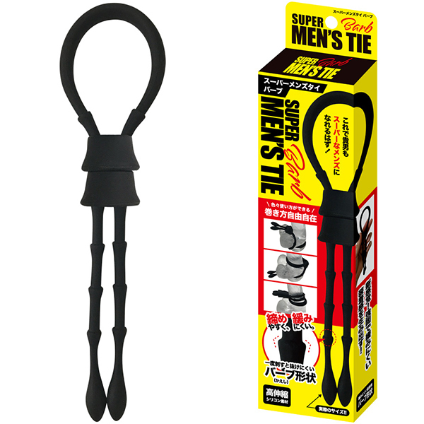 締めやすく、緩みにくい。「バーブ(かえし)」の付いたスーパーメンズタイ!大きな特徴は、円錐のような八の字形状が連なる「バーブ造形」によるロック構造です。「バーブ」とは、配管継手のバーブホースや、釣り針のかえしといった、一度刺すと抜けにくくなる膨らみ造形のこと。その「バーブ」によるロック構造は、シンプルな造りゆえ強固で緩みにくい装着感を生み出します。サクサクと締めやすく、ガチリと緩みにくい、よくあるバネ式ストッパーでは味わえない快適さです。さらに、ストッパー2個付いていますので、二重巻きやダブル巻きなど色々使い方ができる多機能仕様。高伸縮でさわり心地の良いシリコン素材。これで貴男もスーパーなメンズになれるはず!