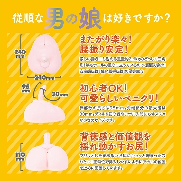 一線を越えますか?背徳感満載の男の娘ボディには「してはいけない感」がいっぱい!どっしり重量約2.6kgの据え置き完全固定型男の娘ホール!激しい動きにも耐えるどっしり三角形!竿もホールの重心に立っているので、腰振り楽々!安定感抜群・使い勝手抜群の優等生!初心者OK!可愛らしいペニクリは棒部分の長さが95mm。先端部分の最大径は30mm。ディルド初心者やアナル入門にもオススメな小さめサイズです。背徳感と価値観を揺れ動かすお尻は正常位で挿入しやすいようにアナルの位置を上めに配置しています。男の娘の引き締まった絶品アナルを思う存分ご堪能ください!従順な据え置き男の娘はフローリングやベッドなどにピタッと固定!挿れて、挿れられ、四方八方どんな方向からの力にも耐えれます。あなたの性癖が目覚めねじ曲がる至極の1本!アソコは好きな形に曲げられる関節骨格内蔵!表面はすべすべ、ふんわりとろける感触。柔らかいのに骨格内蔵だから可動も自由自在。初めての方も、男の娘好きの方も、ニューハーフ好きの方も全てを満足させる万能ペニクリ。耐久性抜群の大臀筋を揉み放題!もう戻れない...戻らないっ!!超リアル構造で特大ギミックいっぱいのはっきり刺激!ぐわんぐわんウネル絶品ケツマ●コ体験!2連特大イボのパーフェクトウェーブにグニグニ巨大壁の弾力プレス!極め付けにはキュッと締まった吸引フィニッシュスポット!まさにお尻絶頂新世界!あなたのサイズに合わせて変化する形状記憶素材!プリプリの本素材は伸縮性が高く、様々なサイズに対応します。使うたびにあなたの形状に変化し、毎回違った締め付け刺激を体感できます。直接肌に触れるものだから、安全性と感触にこだわった高品質なエラストマーを使用しています。保管に便利な専用収納ケース付き。パッケージイラスト:maruku