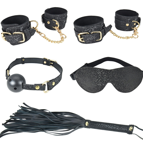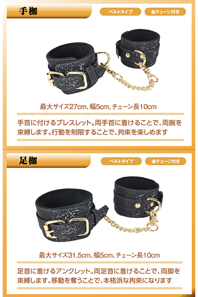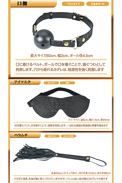 好きなあの子をキラめかせる……。まるでスパンコールのようにキラキラ輝く、絢爛豪華な5点セット「SM5プレミアム」!SMアイテムだって、大切なファッションアクセサリー。他ではお目にかかれない特殊な専用布地を用いたSMアイテムはいかがですか?一見するとマットなブラックカラーですが、光を当てるとキラキラと反射、まるでミラーボールを纏ったようにシャイニーなブラックへとキラめきます!SMセットの内容は、視覚を奪う「アイマスク」、言葉を封じる「口枷」。両手を束縛する「手枷」、移動を束縛する「足枷」、そしてSMの代名詞「バラムチ」と、初めてでも大満足なセレクション。さらに、装着アイテムのインナーには、お肌に優しい柔らかベロア生地を使用しました。金属部は高品質でゴージャスなゴールドカラー。好きなあの子をもっと輝かせ、非日常なラグジュアリーを彩る、ドレッシーなSMコーディネイトアイテムです。