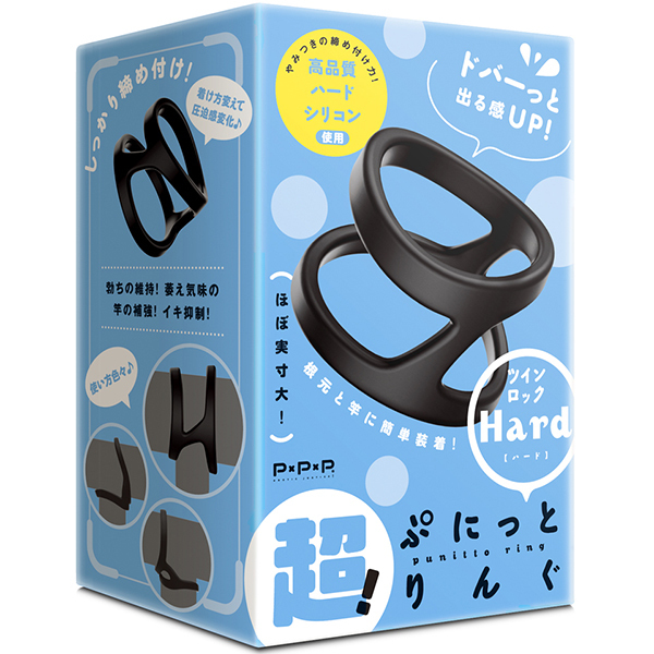 超!ぷにっとりんぐから根元と竿元に簡単装着が出来るツインロックハードverが登場。サッと装着♪ピタッと密着!はずれにくい弾力性、臭いのない高品質シリコンで根元と竿元をしっかり締め付け、着けてるストレスを軽減!すべすべ装着感で毛の巻き込みを緩和。 挟み込んだり押しだしたりタマタマ圧迫の使い方も色々。着け方を変えて圧迫感も変化♪自分好みの締め付けで、勃ちの維持!萎え気味の竿の補強!イキ抑制!クロスさせると包囲圧迫で頑強度MAXに!ハードな締めつけでドバーっと出る感UP♪きゅーっと超極楽発射!