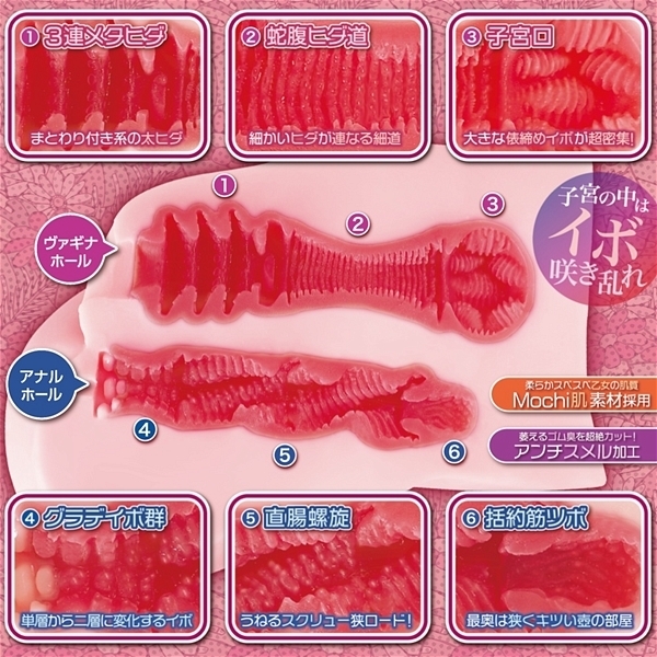 「子宮の中がすごいオナホ」というコンセプトの下、ヴァギナホールには「子宮での快感開花フィニッシュ」に向けて倍プッシュできる増幅ヒダ系を採用した非貫通オナホです。アナルホールは螺旋ベースで構築し、それぞれ異なる個性を持った「疑似粘膜二層構造の2穴」をお楽しみいただけます♪ボディはNOTOWA初の大型タイプで、素材には乙女の太もも感触をイメージした「Mochi肌素材」を使用し!柔らかく滑らかな肌触りにゴム臭も極限までカットしているため、没入プレイを妨げることはありません。快感開花!子宮まん開!「ユーテロ淫ブルーム」で存分にエロスの世界を楽しんでください。柔らかく滑らかな肌触りに加え、ゴム臭も極限カットしていますので、没入プレイの邪魔をすることはありません。