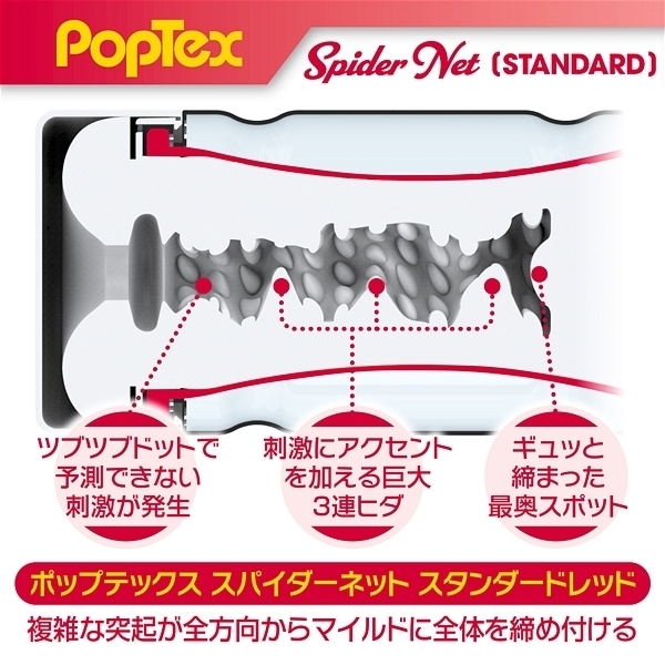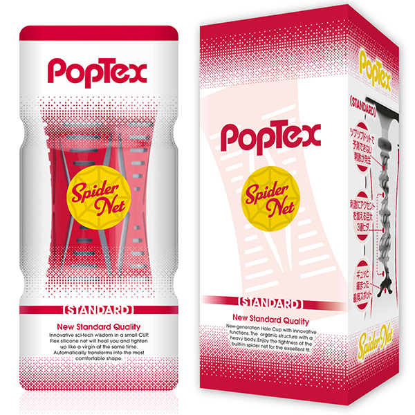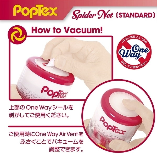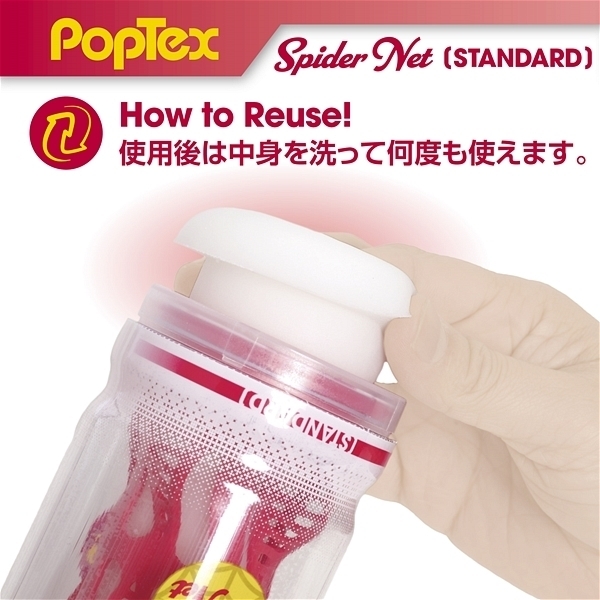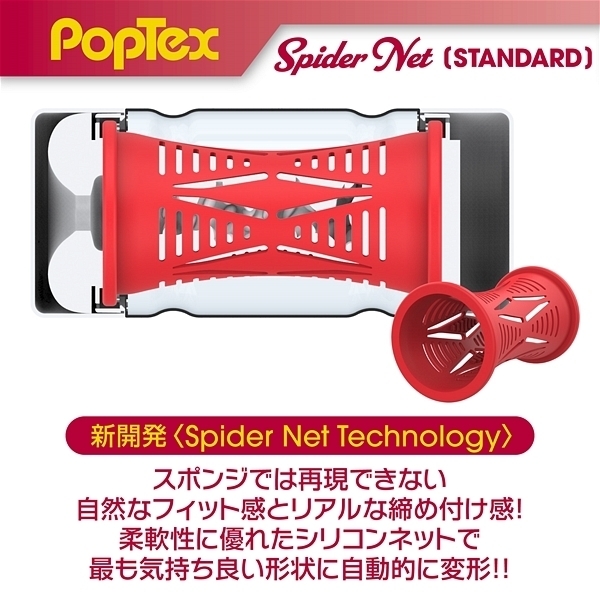 ポップテックススパイダーネットカップスタンダード<リアルな締め付け×ネットヒダ刺激の高機能カップホール>新開発SpiderNetTechnology搭載型カップホール!ホールを包み込む柔軟性に優れたシリコンネットで最も気持ち良い形状に自動的に変形することでスポンジでは再現できない自然なフィット感とリアルな締め付け感を実現しました!内部構造は網目状のネットヒダの中心にアクセントのイボ刺激のアクセント!強力に吸い付く最奥のバキュームスポットは天面の「OneWay」シールを剥がし空気を抜いて挿入することで内部のまとわりつき感をより楽しむことが出来ます。ノーマルタイプのネットと肉厚のホールは抜群のフィット感で飽きのこない快感をあなたにお届けします。使い捨てカップは経済的にも衛生的にもちょっと不安!という方にもおすすめの、本体をはずして洗える「リユースカップ」仕様。ニオイ・ベタつきをカットした使い心地の良いもちもち素材を使用。YELOLABローション付属。
