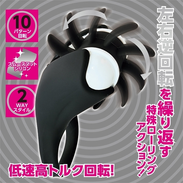 左右逆回転を繰り返す特殊ローリングアクション機能のリング登場。よりリアルな低速回転アクションをハイパワーモーターで実現。指にはめたり、リングとして着用してク○や乳首を刺激!リバース回転を繰り返す動きを含む10パターンアクション。リチウムイオン電池搭載で90分で満充電・最大40分使用可能(使用環境により大幅に増減します)。生活防水性能。リング部は肌触りの良いシリコン素材採用●カラー:ブラック
