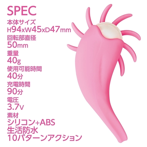 左右逆回転を繰り返す特殊ローリングアクション機能のリング登場。よりリアルな低速回転アクションをハイパワーモーターで実現。指にはめたり、リングとして着用してク○や乳首を刺激!リバース回転を繰り返す動きを含む10パターンアクション。リチウムイオン電池搭載で90分で満充電・最大40分使用可能(使用環境により大幅に増減します)。生活防水性能。リング部は肌触りの良いシリコン素材採用●カラー:ピンク