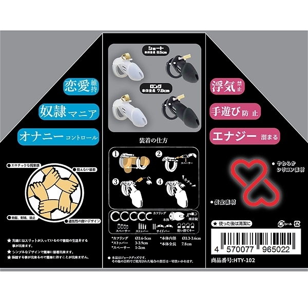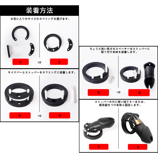 各部品を組み立てることで、あらゆるサイズに適した貞操帯が出来ます。先端に排泄口があるので装着中も排尿が出来ます。南京錠をすることで射●管理を確実に行うことが出来ます。ロング・ホワイト
