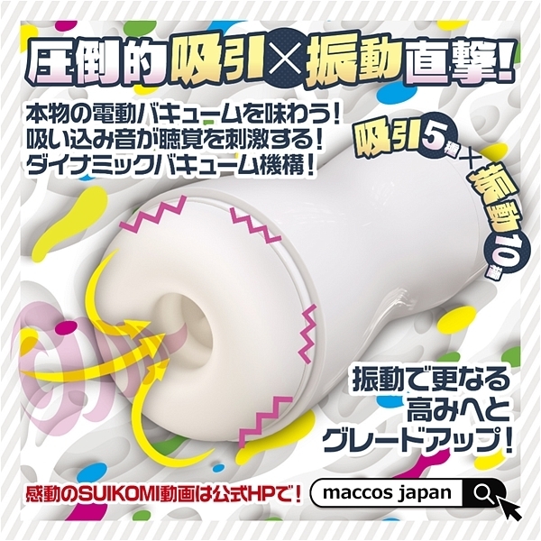 オナホールのバキュームとは全く違う。電動ポンプ並みの吸引が襲う!圧巻のバキューム体験!吸い込み過ぎてあそこがバキューン!の「SUIKOMIバキューン」の登場です。<電動ポンプの吸い込み力>×<振動>は吸い込みパターンの変化や振動パターンの変化で何度使っても新鮮な気持ちで楽しめます。いつでもプレイ(後処理ラクラク)が可能で場所(携帯可能)も問いません。手がベタつきにくい(直接触らない)。電動だから固定して、ボタン操作だけで自動で動きます。上下運動したり、捻じったり、傾けたり、回転させたり、擦りつけたり。深く入れたり、先端だけ刺激したり、フェラチオ耐性強化にも使えます。静穏設計。らくらく後処理。ロングプレイに最適です。<パーフェクトフェラチオマシーン>とでも言うべきなのか?是非ともお試しいただき、この吸い込み、この刺激を体験していただきたい。リラックス時間にどうぞお楽しみください。※ハマりすぎにはご注意ください。