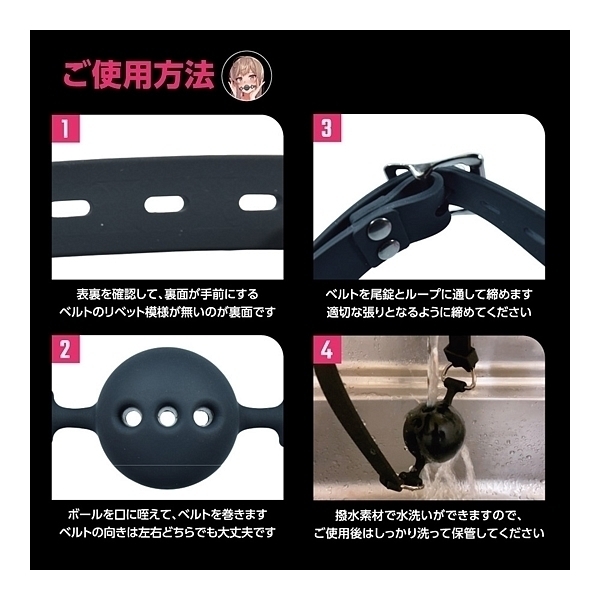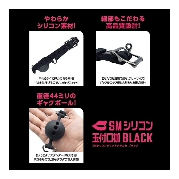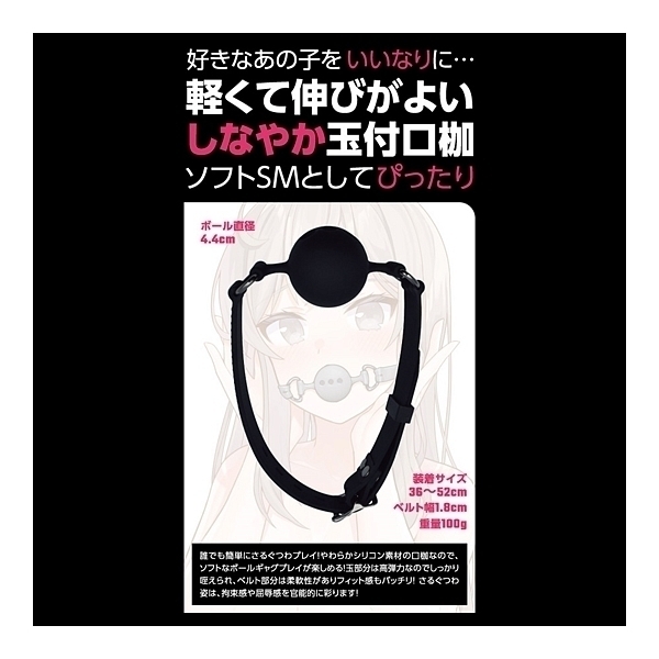 好きなあの子をいいなりに……。SMプレイの代名詞、SM専用ボールギャグ「SMシリコン玉付口枷」!言葉は喋れずにヨダレはだらだら、SMプレイでは欠かせない「さるぐつわ」をお手軽に始められるSMアイテムです。シリコン素材製なので、丸洗いが出来てメンテナンスも簡単、清潔感もばっちりキープ。シリコン特有のサラリとした肌触りだから、不快感もありません。さらに、柔らかめのシリコン素材を採用、柔軟性も高くフィット感もバツグンで、初心者の方でもストレスなく装着しできます!ボールを口に咥えたその姿はとても官能的で、羞恥心を強く煽り、嗜虐性を高めるはず。ボール直径は、標準サイズとなる44ミリ。着用サイズは36〜52センチなので、どなたでも適切に着用出来ます。ベルト部のリベットデザインや、バックル部のつく棒が丸形仕様など、細かいところまで作り込んだ商品設計。ビギナーの方でもSMプレイの魅力を堪能できる、ボールギャグの決定版です!●カラー:ブラック