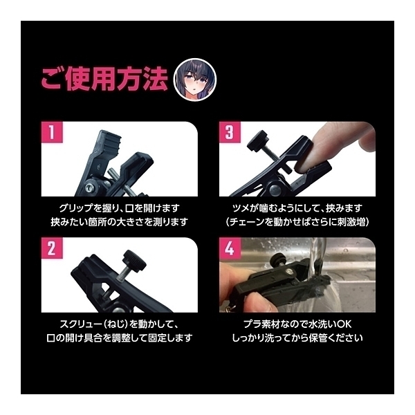 好きなあの子をいいなりに……。SMプレイを盛り上げるアイテム、SM専用クリップ「SM拘束ボディクリップ」!両乳首からチェーンが伸びるその姿は、艶やかな官能的ファッション。SMプレイにとって大切な「痛気持ちよい」を演出するSMアイテムです。クリップ部分は本格構造で、時には痛いほど強力に、時には摘むように弱く、様々な拘束シチュエーションをばっちりフォロー。洗濯バサミのような外見の通り、締め付ける力はとっても強めです。今までのボディクリップでは満足できないエキスパートも、きっと楽しんでいただけるはず。もちろん、ビギナーの方でも大丈夫なように、開口サイズを調整できるスクリュー付き。アナタのお好みな締め付けまで適切に調整できます。クリップの使用する箇所も乳首だけでなく、耳や唇や指やアソコに、と場所を限定せずに色々にお使いいただけます。クリップで挟んで拘束する、痛気持ちよさがSMプレイの興奮を煽ります!