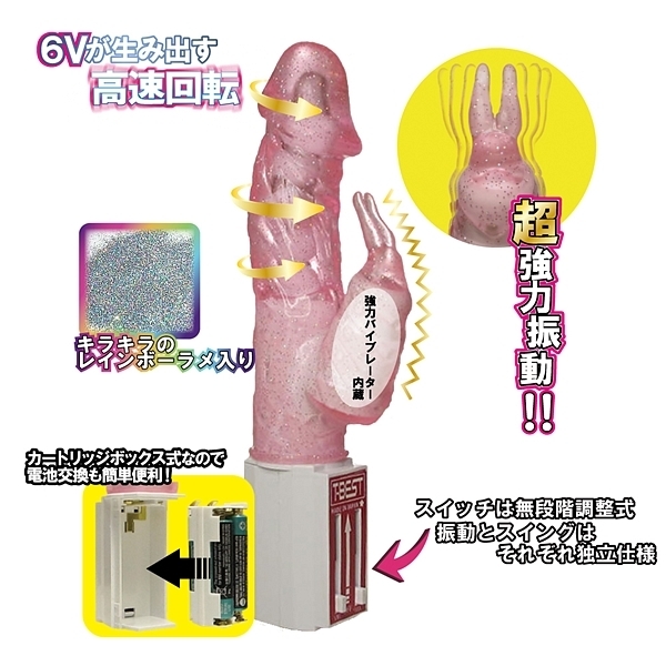 快感は無限に輪廻する…復活を遂げたくねりん棒シリーズから扱いやすいミドルサイズのハイパワーVER.が登場!レインボーラメも入ってキラッキラ☆彡6Vハイパワーが生み出す高速回転で、くねくねグリグリ ぐるぐるとこねくりまわす動きにもうメロメロ!絶頂、即イキ間違いなし!!さらに子機バイブは強力ローター内蔵で先端の突起がブルブル、ク●も同時に快感刺激!!電池を入れればすぐに使える楽々コントロールBOX、しかもカートリッジ式で電池交換も簡単便利!スイッチは振動とスイングがそれぞれ独立、無段階調整式でお好みの速度でお楽しみいただけます。単4電池4本使用(アルカリ電池推奨) 静音タイプ!安心・安全の日本製