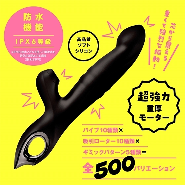 気持ちイイとこ全部責め♪究極ギミック搭載で奥イキ・中イキ・外イキ革命!ヘッドが前後に揺さぶり超ポルチ責めするスクラッチヘッドギミック!数珠形状のリングが上下にスライドし、感じるスポットを超擦り責めするスクラッチリングギミック!チュパチュパ吸引でクリイキ仕様の吸引ローター!バイブ振動10種類に吸引ローター10種類、ギミックパターンが5種類で脅威の全500バリエーションで楽しめます。超強力重厚モーター で芯から震える重くて強烈な振動!肌ざわりなめらかな高品質ソフトシリコン仕様です。本体は充電式なのでエコに使用可能。本体:充電時間約100分※本体:最大連続稼働時間約50分(初期振動パターン未変更時)_IPX6等級_バイブ・ローター各10パターン振動_ギミック5パターン可動_付属品:USBマグネット式充電ケーブル※IPX6:放水ノズルを使って噴流水を最低3分間あてる試験(浸水は不可となります)●カラー:ブラック