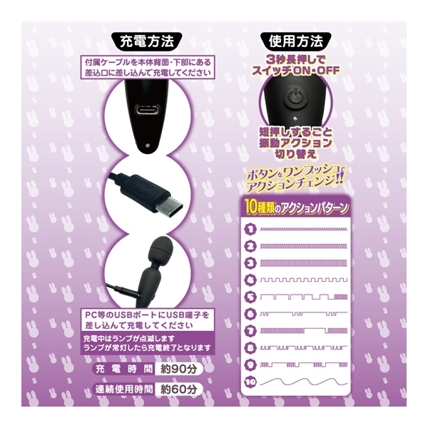 カワイイ見た目でとってもパワフル!USB-C対応の充電式ミニ電マが新登場!全長85ミリの小さくて可愛いミニサイズの電マです。小さなボディに、高出力の充電バッテリーとハイパワーな振動モーターを内蔵しました。アクションパターンは10種類もありますので、お好みの振動を見付けましょう!さらに、充電方法に最新となるUSB-C方式対応。お使いのスマホ充電環境で、そのままで充電できます。乾電池要らずなのでコスパも抜群。不意な落下を防ぐ、オシャレなシリコン製ストラップ付き。スベスベで肌ざわりの良い、ヘッド部シリコン素材。軽いからどこでも持っていける、重さ26グラム。自由に曲がる、フレキシブルネック。充電時間約90分で、連続稼働約60分。「スリム」は、スッキリとした細身が特徴的なスマートデザイン。ヘッド直径26ミリ!初めての方でも大満足の、チャーミングでラブリーなミニ電マ!●ブラック