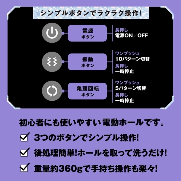 亀頭回転パワフル振動のハイクオリティ電動オナホが登場!一番敏感な亀頭に回転5パターン!竿部分には芯まで震えるヘビー級振動10パターン!全50バリエーション!異なる性感帯に最適な刺激を与える快感コンビネーション!高性能モーター搭載によりパワフルなのに静かな回転振動を実現しました。稼働音を気にせずプレイに集中できます。初心者にも使いやすい電動ホールです。シンプルな3つボタンで片手でも操作が可能です。インナーホールを取って洗うだけなので、後処理も超簡単です。重量約360gで手持ち操作も楽々です。直接肌に触れるものだから、安全性と感触にこだわり高品質なエラストマーを使用しています。伸縮性抜群の柔らか素材が吸い付きながら絡みつく粘膜刺激!もっちり柔らか人肌感触の挿入口はリアルを超えた幸福快感!竿部分をダイレクトに刺激する360°ビラビライボの敏感刺激!最先端技術によりコンパクトなのにパワフル&多機能!インナーホールにもこだわった電動ホールです!静音設計≦60dB。充電用USBケーブル付属。