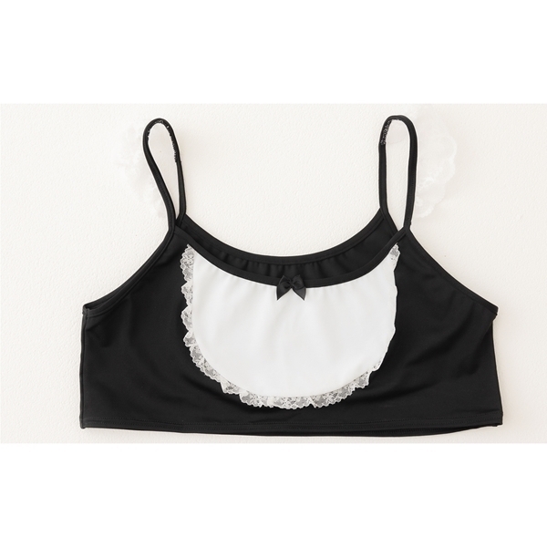 日本国内の工場で縫製された、伸縮性のある肌触りの良いマイクロファイバー生地を使ったメイドスタイルのショート丈のキャミソール。短い丈でバストラインを可愛く、綺麗に魅せるメイド風デザインのクロップトップキャミソールです。