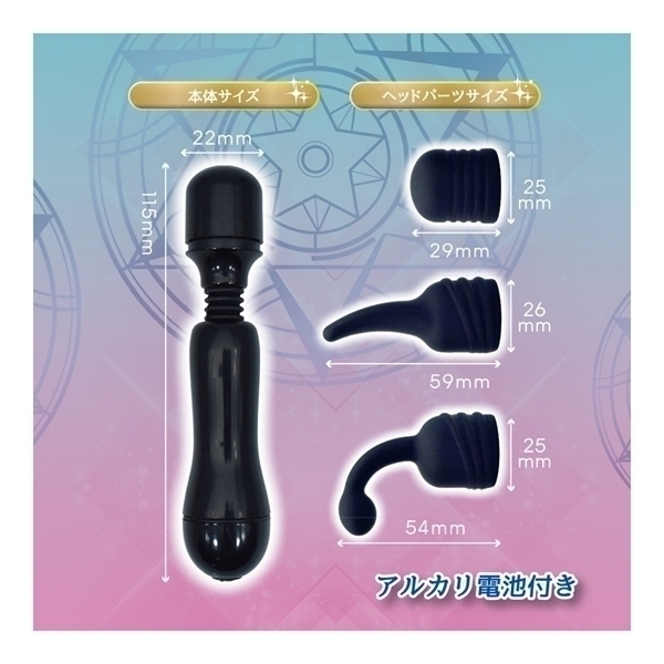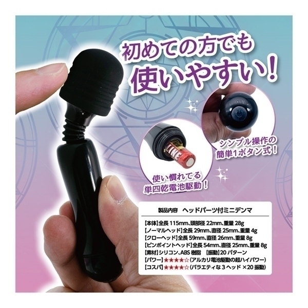ヘッドパーツの付け替えで、プレイ感覚が変わる!3種のヘッドパーツがセットになった、小さくて可愛いミニ電マが新登場!付け替えできるのは、アタッチメントのヘッドパーツ。スタンダードな丸みのあるノーマルヘッド、爪のように伸びたクローヘッド、狙ったスポットへ的確直撃が楽しめるピンポイントヘッド、とがセットになりました。付け替えることで異なる快感を楽しめます。さらに、この快感を煽る振動アクションはなんと20パターン!バリエーションに富んだアクションは、きっとお好みが見付かるはず。3ヘッド×20振動で、新しい快感へと飛び出しましょう!ヘッドパーツの素材は、肌ざわりの良いシリコン製。どこにでも持っていける、重さ50グラム。使い慣れてる&強力な、アルカリ乾電池式。自由に曲がる、フレキシブルネック。分かりやすい、シンプル操作のワンボタン式。初めての方でも大満足、快感キュンが止まらないミニ電マ!●カラー:ブラック
