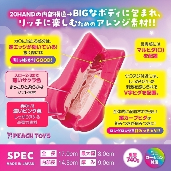 人気の20HANDをベースに、大きなサイズでリッチな使用感を追求した非貫通オナホールです♪「肉厚でしか味わえない使用感」をコンセプトに設計され、高弾力素材による包まれる感触とまったり楽しめる内部構造を実現しています!入口部分は丸く使いやすく、薄いサクラ色の柔らかい素材が3分の2までのエリアを包み込んでいます♪絡みつく縦ヒダがメインの構造で、柔らかい触感を楽しむことができます!奥の部分には、濃いピンク色のしっかりとした刺激素材を採用し、フィニッシュに向けての役割を強化♪「手前で遊んで、奥でフィニッシュ」というテーマは従来のモデルと同じながら、このBIG版では奥の弾力をより深く感じられる設計です!日本製の高品質で、特別なリフレッシュタイムを提供します♪