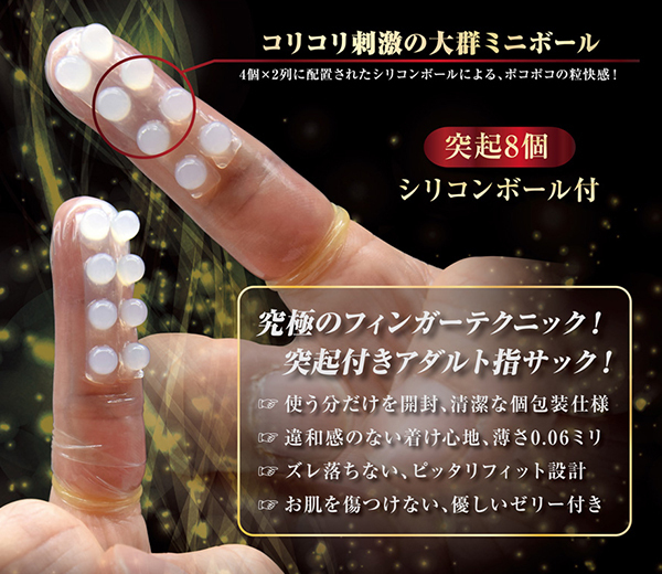 安全、清潔に使えて気持ちいい♪ラブグッズ版の指サック「フィンガースキンDX (G−4)」です。シリコン製のミニボールに突起が8個ついた指サックでクリトリスを愛撫したりアソコに挿入したりと使い方は自由自在!4個×2列に配置されたシリコンボールはアソコに挿入するとボコボコの粒快感♪6個入りで個包装されているので清潔にお使いいただけ、Gスポットをズリズリしたりと着けるだけでご自身の指技をグレードアップしてくれます!薄さはコンドームのような0.06mm。挿入したときの体温が感じられたりとお互いに興奮すること間違いなし!表面には挿入をフォローしてくれるゼリーが塗布されていて平均的な男性の指サイズだからフィット感も抜群。指責めのメリットを味わいながらコリコリ感やズリズリ感を与えることができます!