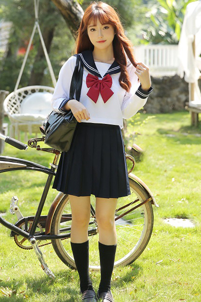 > <malymoon>紺×白色の赤リボン長袖セーラー服
