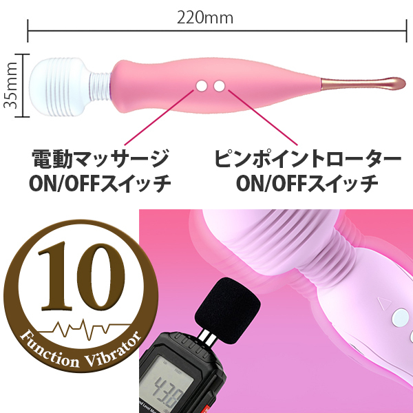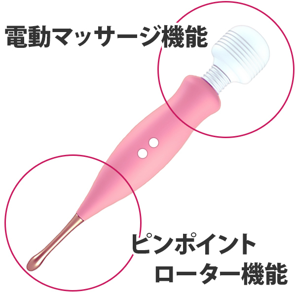 通常では味わえない快感が味わえる!クリトリスを責めるのが好きな人にぴったりの「電マ+ピンポイントローター」です。これまでのクリトリス攻め系グッズに飽きた方に!これ一本でクリトリスを存分に気持ちよく刺激♪クリを刺激するセルフプレジャーアイテムは数多くありますが、電マのようなコンパクトさと利便性、そしてピンポイントで刺激してくれる機能性を兼ね備えた高品質なローターバイブレーターです。クリをピンポイントで刺激するも良し!もちろんクリも含めて周りを刺激するも良し。これまでにない新たな快感をこのグッズで楽しむことができますよ♪※電源のボタンは別れており、ボタンを2秒間長押しする事で電源のonとoffを切り替えられ、電源onの状態でボタンを押すごとにパターンを変更できます。