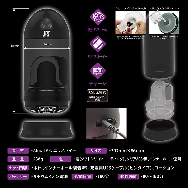 これが「真のバキューム」だ。ディープスロート強力電動吸引、さらに雷のような振動が襲う(バイブ内蔵)。電動エアポンプで「物理的に強力吸引」する電動バキュームマシンが誕生。10種類のバキューム吸引&10種類のバイブ振動。絞るように吸い込んで、奥で震えるのが電動オナホール「NOL VACULLA(バキュラ)」です。●スイッチは3個だけ、迷いのない簡単操作。●電源ON/OFF用スイッチ:1.5秒の長押しでON/OFF●バキュームポンプスイッチ:10種類のバキューム動作をコントロール●バイブ振動スイッチ:10種類の振動パターンをコントロール(バキュームと振動は同時利用可能です。どちらかのみを選んで楽しむこともできます)●最大稼働時間・180分。大容量バッテリー搭載。●手軽なUSB充電方式(充電用USBケーブル付属)●ローション付属(GLEPIS LOTHON)