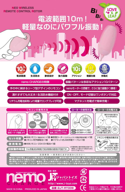離れた場所から電波を送信!ブルブル震えるパステルピンクのワイヤレスローター。●前作より軽量化・小型ハイパーモーターを内蔵●送信距離は約10m・パターン10種を1ボタン操作●電池式リモコン:23A12V×1本使用(予備1本付属)●2秒以上の長押しで起動●マグネットUSB充電式ローター:電源入切をライト点灯でお知らせ●2時間でフルチャージ(約2時間使用可能)●生活防水+静音仕様。電池の無駄な消耗を防ぐため、使用後は必ずOFFにしておきましょう。※付属電池は動作確認用です。