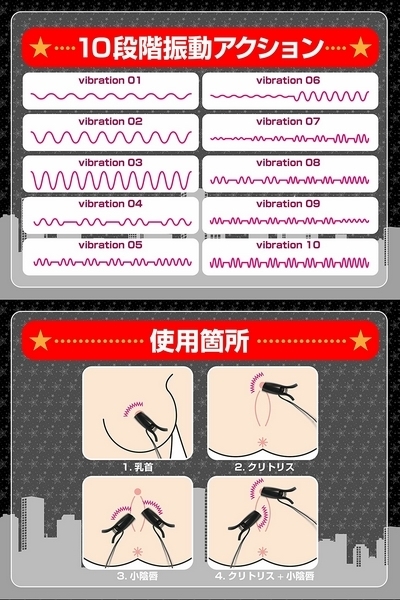 ダークなブラックカラーのワイヤレスクリップ型ローターです♪生活防水加工が施されたマット仕様なクリップ型ローターはサラッとした肌触りで、重さは約8gと着けていても疲れにくいほどの重量。挟み心地は痛すぎず、しかし脱落しづらい力加減で、ローターの震動をしっかり感じていただけます♪震動アクションは豊富な10種類!乳首やクリなど、お好みの箇所に挟んでお楽しみください♪また、遠隔操作にも対応で、送受信距離はおよそ10m。屋外での野外プレイにも最適です!1人はもちろん、パートナーさんとのプレイにもぜひお使いください♪本体はUSB充電式で、約2時間の充電により1時間ほどの連続稼動が可能となっております。リモコンは23A12V電池×一本を使用(別途予備電池が1本付属)!本体付属の電池、予備電池は動作確認用のため、お早めの交換をお願いします。ローターは電波を受信するたびに電池を消費してしまうため、使用後は必ず電源をオフにして保管してください!使用する際はリモコン用電池の絶縁体を外してからお使いください。