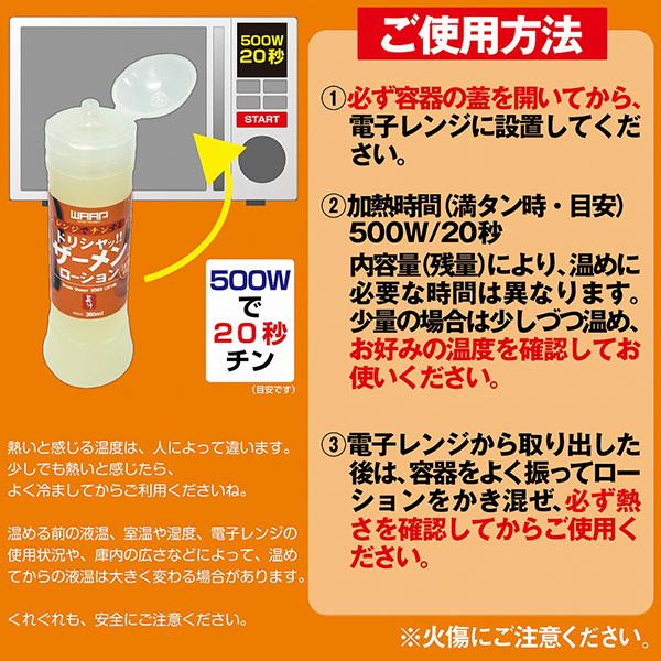 「ローションを温める時代」ついに到来。射精したばかりの精子の温かさをリアルに再現!電子レンジ温めてリアルにほんのり温かい精子のヌクモリを感じてください。<使用方法>(1)必ず容器の蓋を開いてから、電子レンジ内に設置してください。(2)加熱時間(満タン時・目安):500W/20秒(3)電子レンジから取り出したら後は容器をよく振り、ローションをかき混ぜ、適温を確認しながらご使用ください。※ホールの残量が少なくなるにつれ温め時間も短くして下さい。
