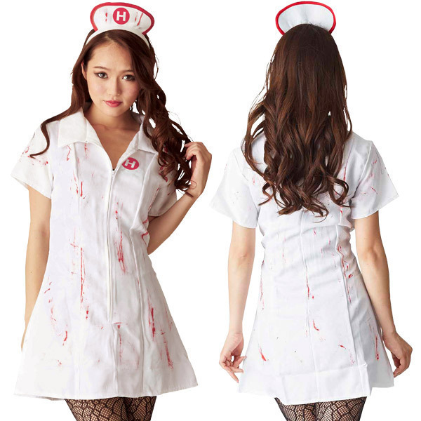 【TOKYO GIRLS COLLECTION】東京ガールズコレクションとのコラボ企画「TOKYO GIRLS PRODUCERS」監修!リアルな鮮血でゾンビ感アップ!血のり付きのミニスカナースワンピースセット。白衣・ナース服の通販なら激安価格の当店で!●綺麗なAラインのナースワンピ●ゾンビ風の血のり加工済み●前ファスナーで開き具合を調整●裾から15cm上まで開閉可能●ナース帽風のカチューシャ付属●ワンポイントロゴ入り●モデル身長:158cm。生々しい血しぶきを浴びた白衣の天使コスチューム!ハロウィンメイクの定番、ゾンビ風メイクにしてとことん楽しみたくなるホラーなアイテムです。